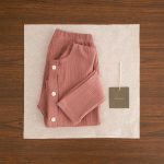Pamuklu kumaştan üretilmiş iki parçalı pijama takımı. Tişört bisiklet yakalı ve uzun kolludur. Önden düğme kapamalıdır. Pantolon, rahatlık sağlamak için elastik bir büzgüye sahiptir.