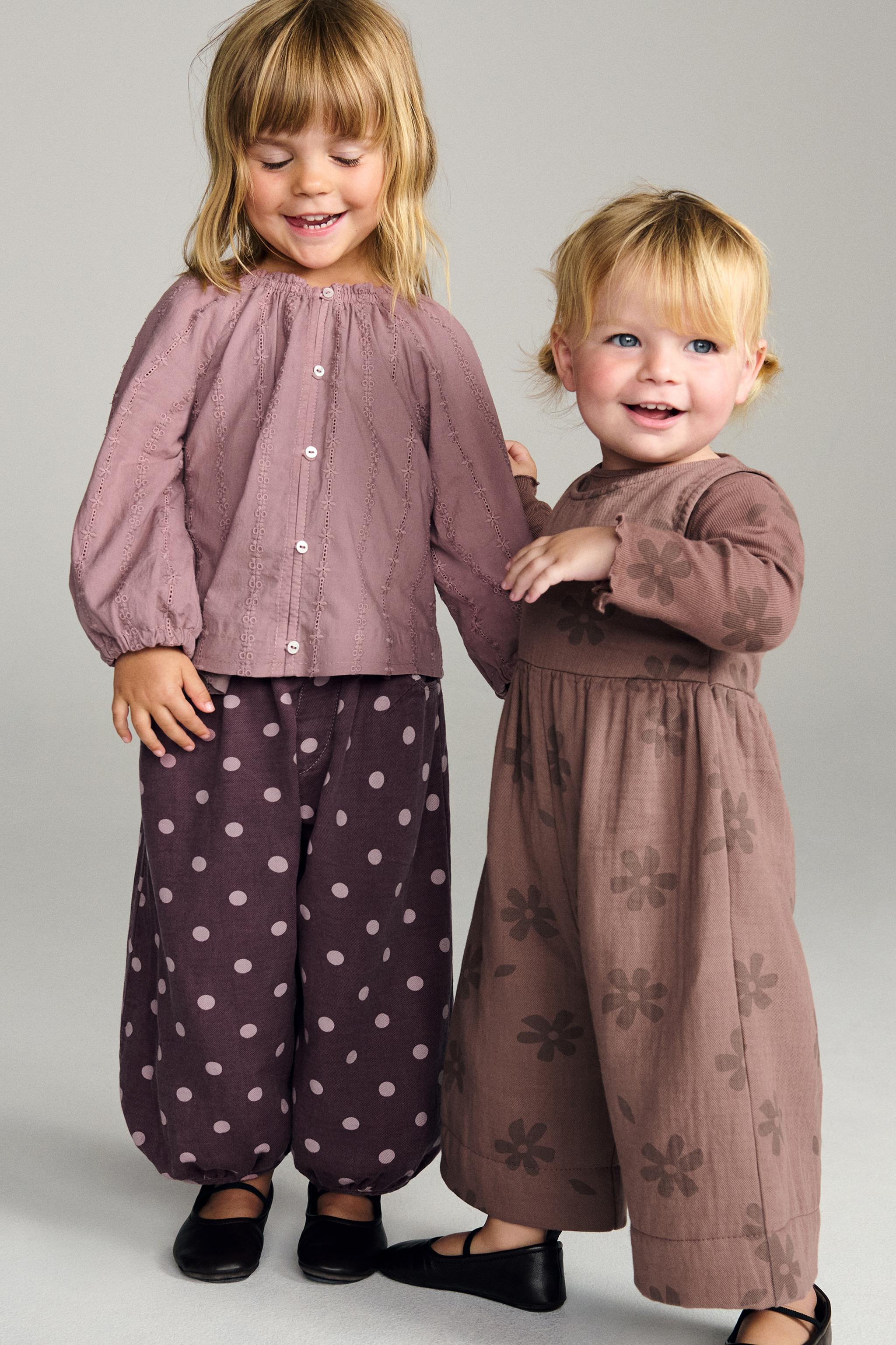 • Pamuklu kumaştan balon kesim pantolon. Rahatlık sağlaması için elastik bir bel bandına sahiptir ve detay olarak ön kısımda giysiye hacim katan pileler bulunur.