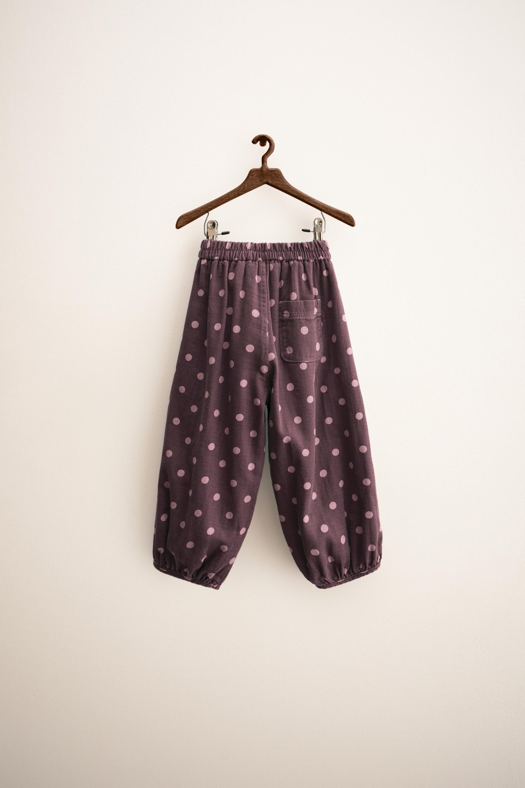 Pamuklu kumaştan balon kesim pantolon. Rahatlık sağlaması için elastik bir bel bandına sahiptir ve detay olarak ön kısımda giysiye hacim katan pileler bulunur.