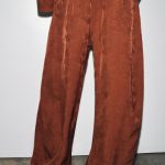 شلوار ساخته شده از نخ ویسکوز. دارای جزئیات بافت جکارد. پاچههای گشاد. بسته شدن از کنارهها با دکمه.
