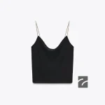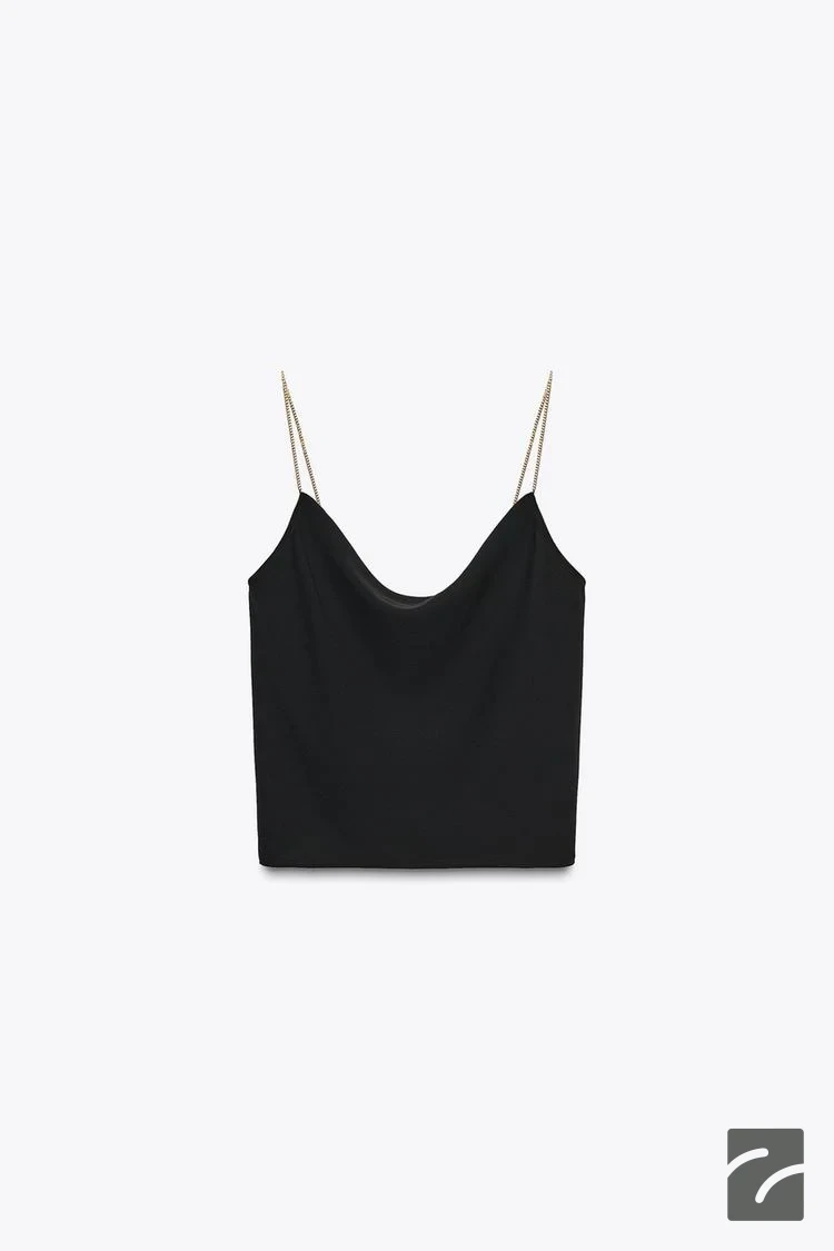 تاپ ساتن با یقه دکوکمی و جزئیات زنجیری، با بندهای نازک و طراحی شیک.