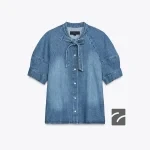 - Aynı kumaştan bağcıklı, ayarlanabilir bisiklet yakalı gömlek. Kısa, kabarık kollu. Yıkanmış efektli. Düz etekli. Önden düğme kapamalı.