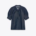 - Aynı kumaştan bağcıklarla ayarlanabilen bisiklet yakalı gömlek. Kısa, kabarık kollu. Düz etek ucu. Önden düğme kapamalı.