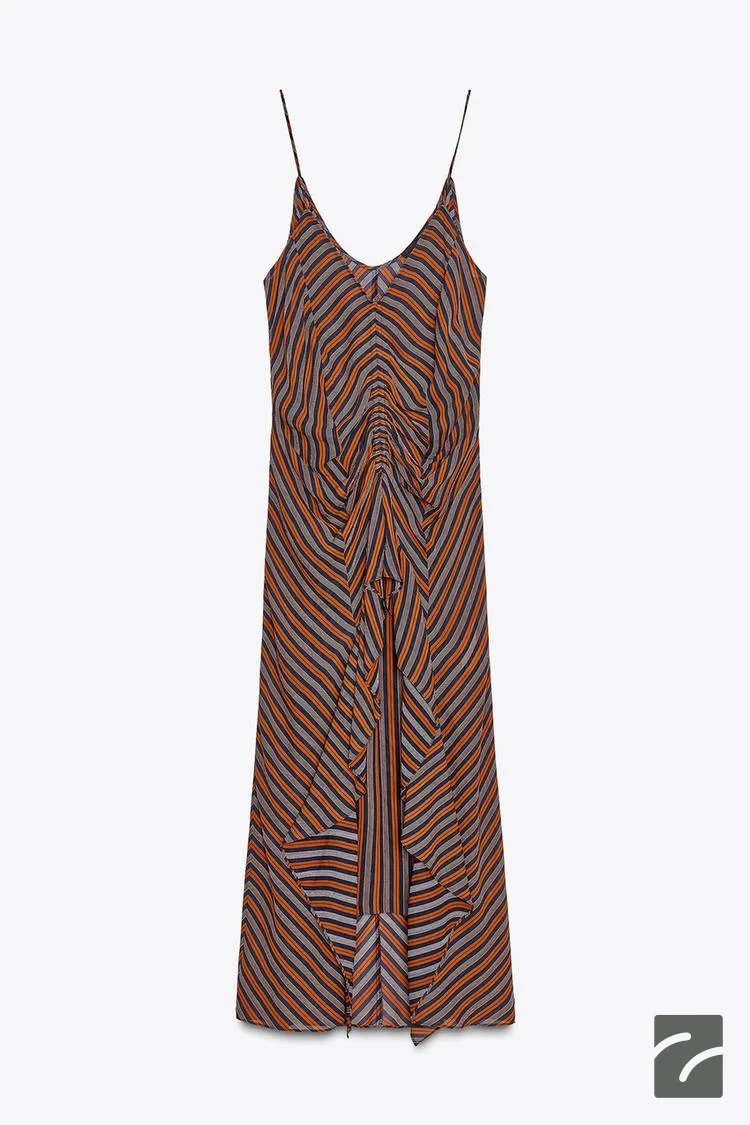 - V yaka, ince askılı elbise. Önü büzgülü detaylı. Asimetrik etek ucu.