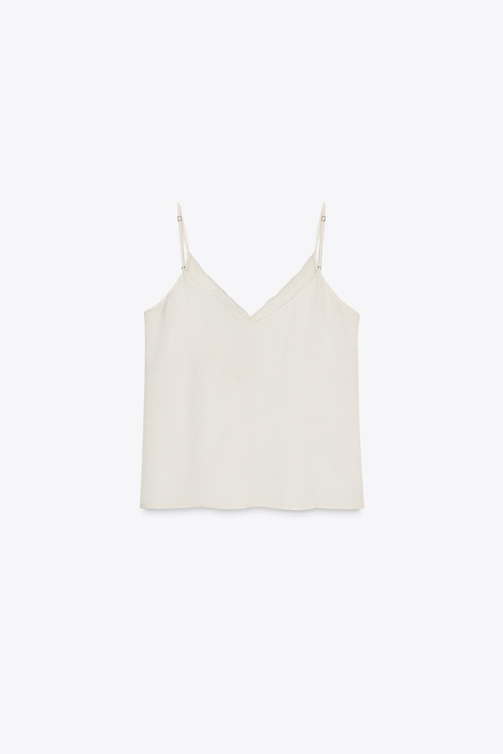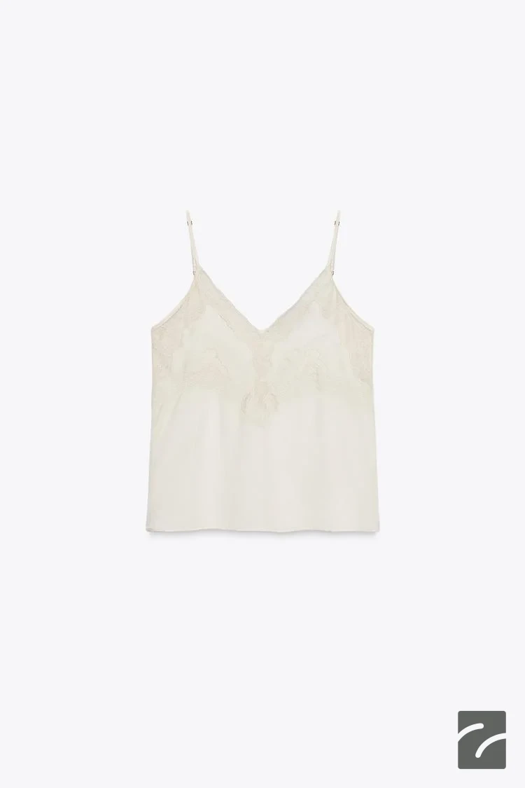 - V yaka, ince, ayarlanabilir askılı üst. Aynı tonda dantel aplikeli.