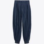 - Denim kumaştan üretilmiş pantolon. Orta yükseklikte ve kemer köprülü bel. Ön ve arka cepler. Kontrast oluşturan belirgin dikiş detayları. Manşetle tamamlanan büzgülü paça. Fermuar, düğme ve metal kancalarla ön kapama.