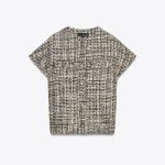 - Bisiklet yaka, kısa kollu yelek. Dokulu kumaş detaylı. Düz kesim etek ucu. Önü kabartmalı metal düğme kapamalı.