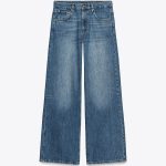 - Düşük belli ve kemer köprülü jean. Beş cepli. Geniş paça. Fermuarlı ve metal düğmeli ön kapama.