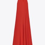 Viskoz karışımlı iplikten üretilmiş uzun elbise. Halter yaka ve açık sırt detaylı. Asimetrik etek ucu, yan yırtmaçlı. Yakası düğme kapamalı.