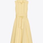 - Pamuk iplikten üretilmiş midi elbise. Gömlek yakalı ve kolsuz. Yanlarda dikişe gizlenmiş cepler. Aynı kumaştan, bağcıklı ayarlanabilir kemer. Patletle gizlenmiş ön düğme kapamalı.