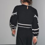 بلوزی از الیاف پنبه‌ای. یقه گرد و آستین‌های بلند و بادکنکی. دارای جزئیات با دوخت متضاد. قسمت پشت باز و دکمه‌دار.