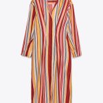 این لباس میدی از الیاف پنبهای تهیه شده است. دارای یقه پیراهن و یقه V است. آستینهای زیر آرنج با دکمه قابل تنظیم هستند و بسته شدن جلو با دکمههای مخفی انجام میشود.